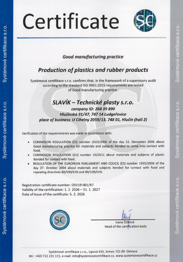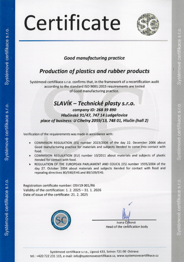 Certification of ČSN EN ISO 9001:2016 and GMP (Good Manufacturing Practice for the food industry).